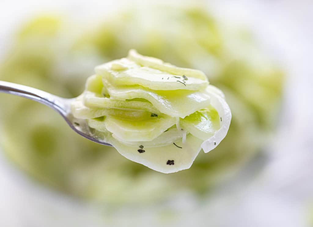 This simple German cucumber salad, also called Gurkensalat, is a fresh and creamy side dish that’s been passed down from my Great-Grandmother. There are many ways to make it, but this easy version keeps the cucumber skins on for extra flavor and crunch. It’s delicious right away, but even better after it has time to marinate!